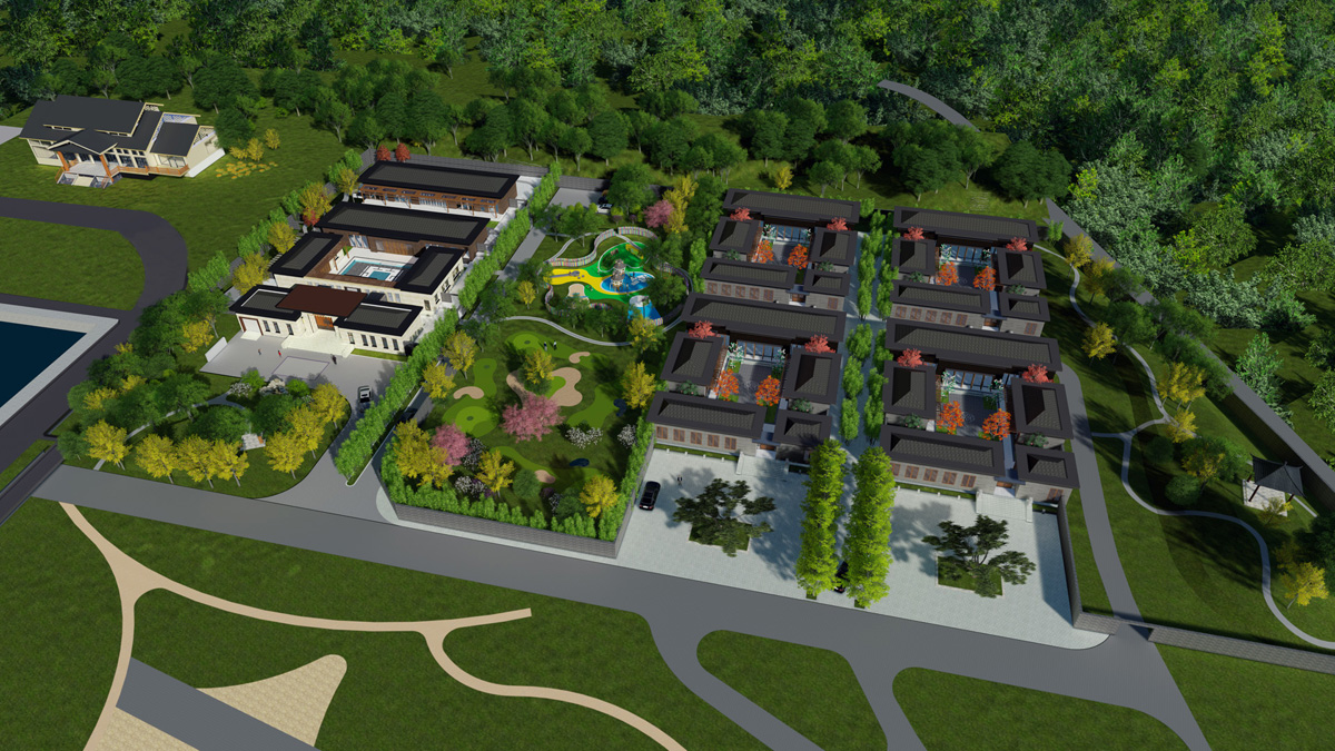 私属庄园设计分为南北两个地块,南侧以现状果林为主,打造私属主题公园,植物采用当地枣树、石榴树、苹果树为主,搭配景观树木点缀。北侧景观设计以“核心”景观为主导,核心景观位于两院之间,设计以儿童主题乐园、高尔夫为主,设计风格为新中式景观。